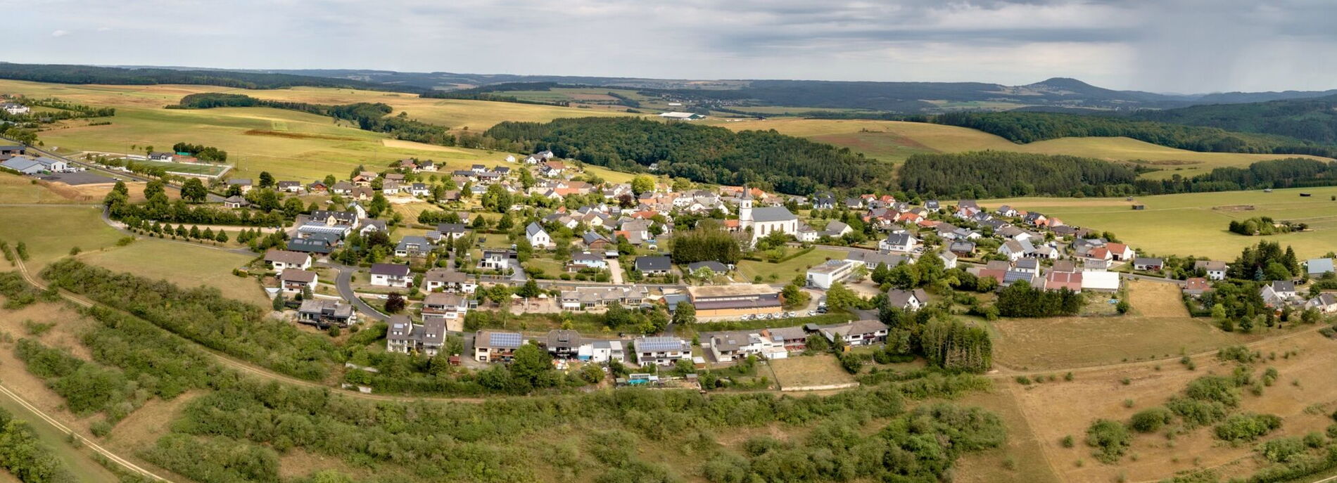 "Üxheim" geografisch betrachtet ist ein Dorf. "Üxheim" in kommunaler Sichtweise ist die Ortsgemeinde, die aus insgesamt 4 Ortsteilen bzw. 7 Ortschaften besteht, wobei "Üxheim-Ahütte" einer der 4 Ortsteile ist. Die beiden ehemals eigenständigen Dörfer "Üxheim" und "Ahütte" sind nämlich seit längerem unter dem Ortsteil-Namen "Üxheim-Ahütte" verwaltungstechnisch zu einer administrativen Einheit verbunden. Und auch das Luftbild zeigt, dass die Bebauung den Verbundnamen tatkräftig unterstützt. Noch ein paar Häuser entlang der "Hähnchenstraße" (Unten im Hähnchen / Oben im Hähnchen) - dann ist der Übergang nahtlos.